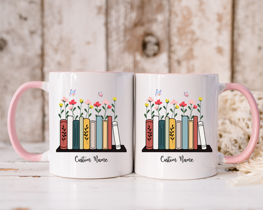Book Lover Mug with Bookshelf and floral Theme, Custom name mug Book lover , Reading Mug Gift for Teacher, Reader, Coworker, Boss or Mom