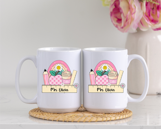 Custom Teacher Coffee Mug, Personalised Rainbow Pencil Coffee Cup, Custom Name Appreciation Gift, Back to School, Ceramic Mug For Educator