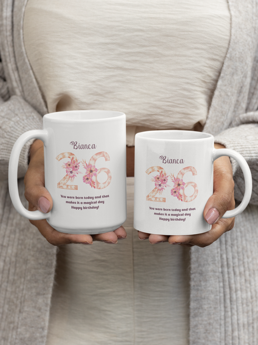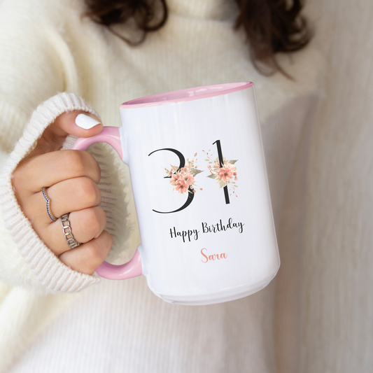 Custom Floral Age Mug with Name and Phrase Design Personalized Birthday Gift for Mom Friend Daughter Wife or Coworker 20th to 70th Age Opt