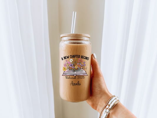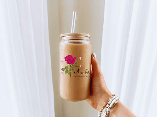 Retirement Sipper Glass with Custom Name & Floral Art, BPA-Free 16oz Glass with Lid Option, Thoughtful Gift for Retirement Celebration