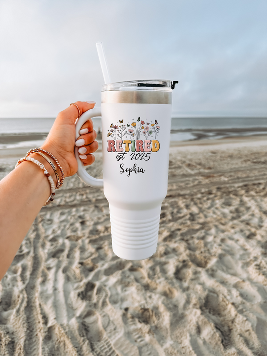 Personalized Retirement Tumbler, Gift for Retiring with Custom Year and Name, Travel Cup for Teacher Retiring, Happy Retired Coworker Boss
