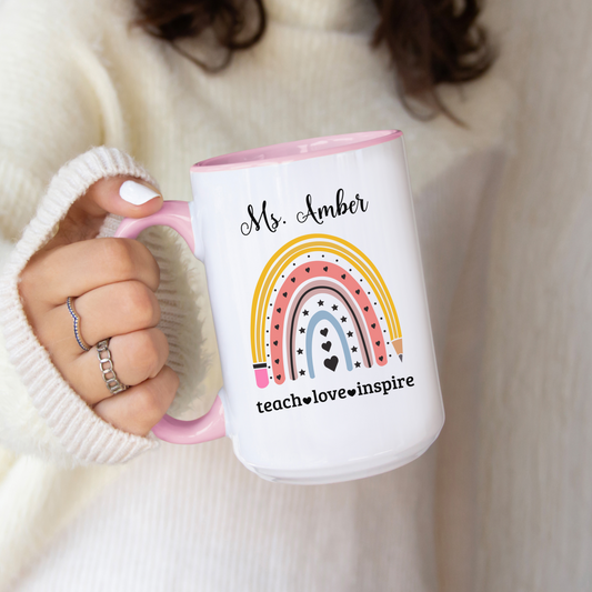 Personalised rainbow and pencil teacher mug custom name coffee cup perfect teacher appreciation thank you teacher gift back to school gift
