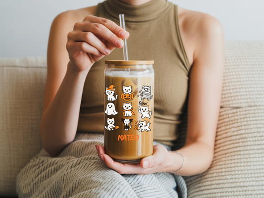 Custom Halloween Sipper Glass with Stamped Cats – Personalized Cat Lover Glass with Name