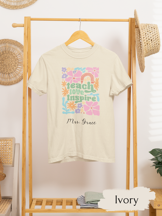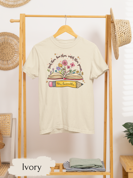 Personalized Teacher Shirt, Custom Name T-Shirt for Kindergarten Preschool, Cute Floral Teacher T-Shirts Comfort Colors Back to School Gift